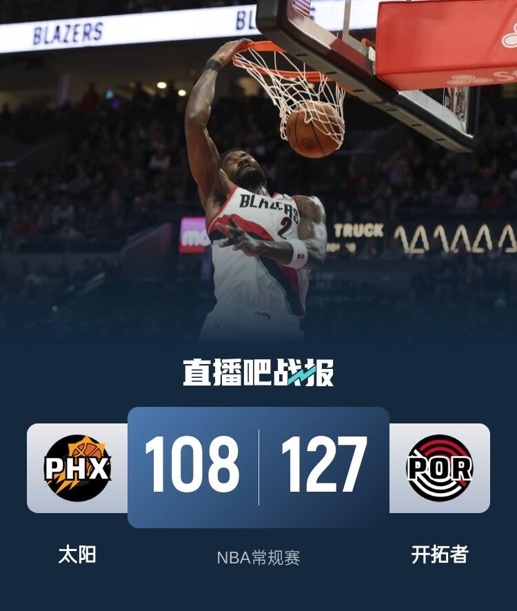 开场后太阳手感一般,开拓者内外开花取得领先,随后杜兰特接连砍分帮助太阳咬住比分。第二节上来布克和比尔轮番发力为太阳追分,但太阳其他球员手感一般,反而是开拓者在第二节后半段掀起攻势将分差拉大到两位数。下半场回来,布克依旧表现神勇接连砍分,太阳一度追到差10分,但开拓者立马回应一波12-2的高潮将分差拉大到20分。最后一节布克依旧努力为太阳追分,但无奈队友状态都比较一般,开拓者全面开花没有给太阳缩小分差的机会,最终开拓者127-108轻松击败太阳取得3连胜,也是最近8场比赛赢下7场。