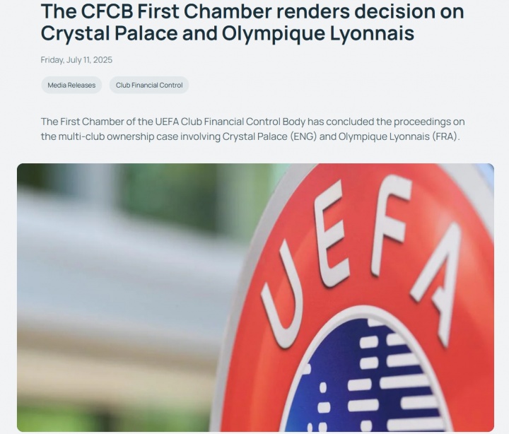 随后,CFCB第一委员会继续评估里昂奥林匹克和水晶宫提交的文件,并得出结论:截至2025年3月1日,这两家俱乐部违反了《欧足联俱乐部赛事规则》第5.01条规定的多俱乐部所有权标准。