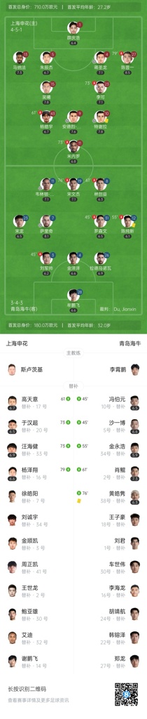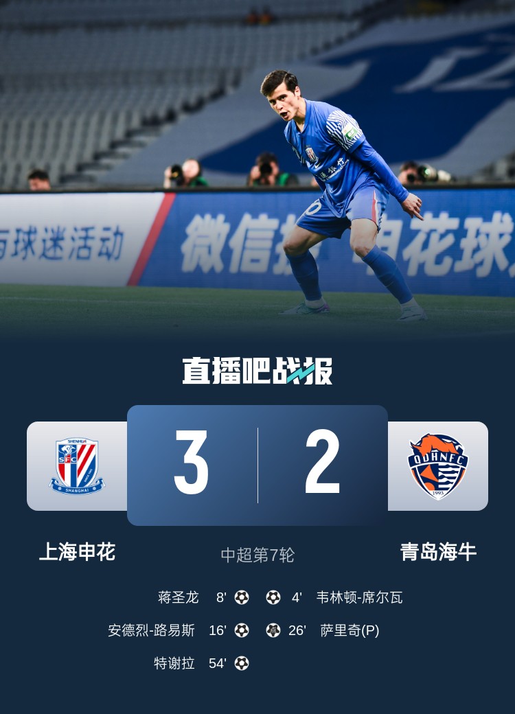 全场比赛结束,上海申花3-2击败青岛海牛。